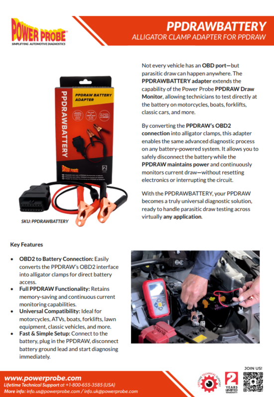 Not every vehicle or machine has an OBD port—but that doesn’t mean parasitic draw isn’t a problem. From motorcycles and classic cars to forklifts, boats, and small equipment, battery drain can occur anywhere there is a battery and electrical system. The PPDRAWBATTERY adapter expands the capability of the Power Probe PPDRAW Draw Monitor, allowing technicians to diagnose parasitic draw directly at the battery using alligator clamps.